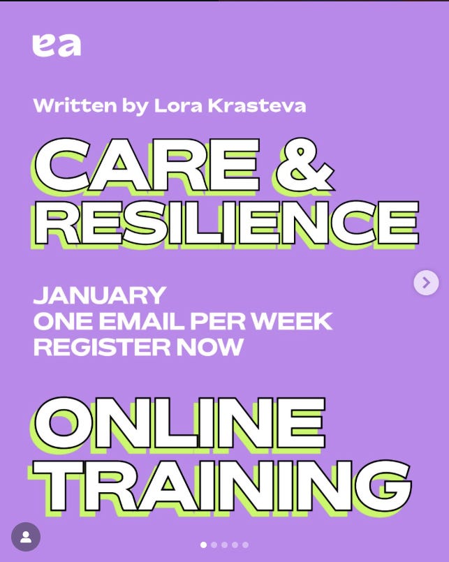 I’ve partnered with European Alternatives to create an online, self-paced, written training abour care and resilience. More than just lighting a candle, drawing a bath and hoping for the best, this series of newsletters will compile lots of practical tools and exercices for in-depth work without overwhelm.